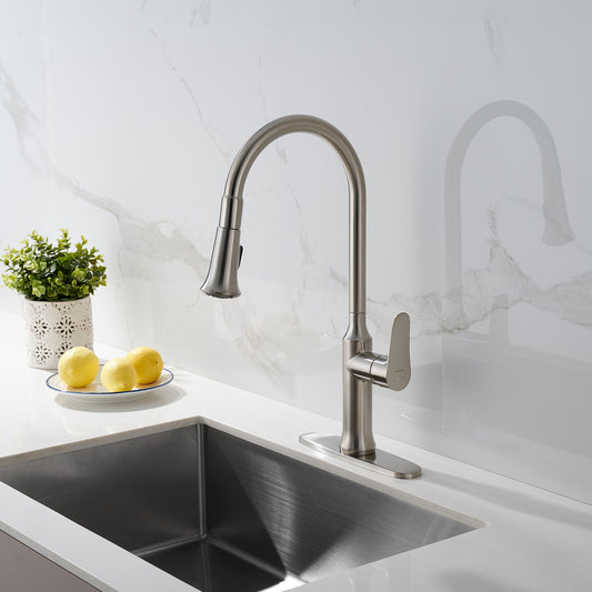 TimeArrow Kitchen Faucet with Pull Down Sprayer Brushed Nickel, High Arc Single Handle Kitchen Sink Faucet with Deck Plate, TAF782C-BN