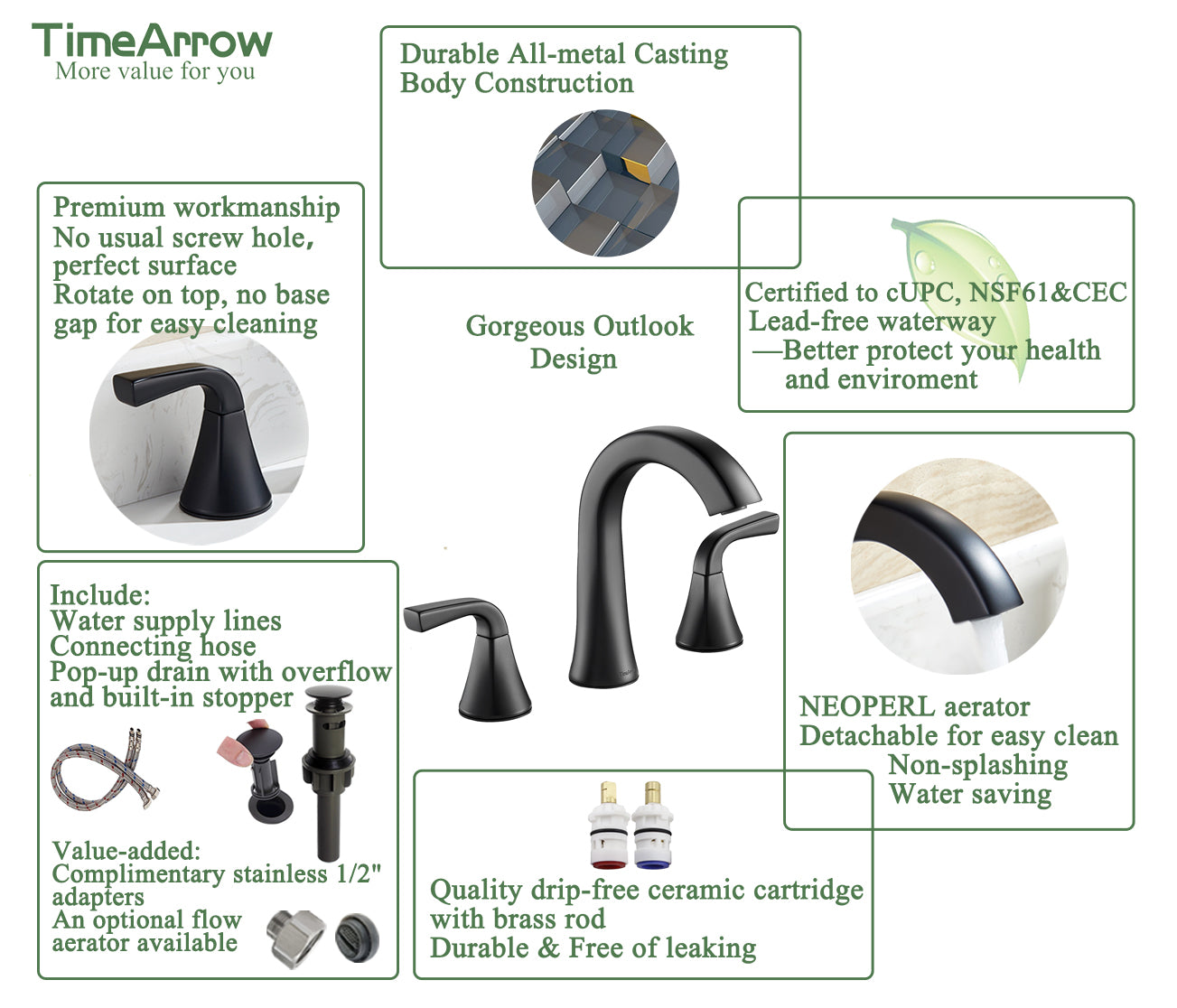 - Durable All-metal Casting Body Construction, Lead-free Waterway, High Quality Ceramic Cartridges Free of Leaking, High Performance Aerator with Flow Rate of 1.2GPM @60psi (CEC listed) Save Water without Compromising Performance.